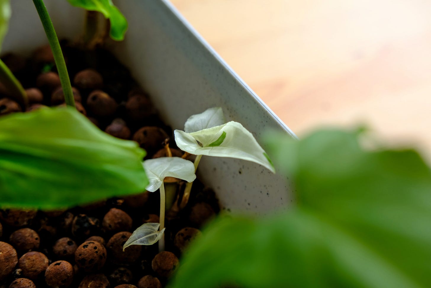 Gardening is a deceptive sport. It looks gentle, even geriatric—tender hands patting soil that nourish fresh dewy nubbins. And sometimes, that is what is needed. But my favorite part of gardening is arguably the most important. The ruthless pruning. Sharp, sterile shears cutting back node by node, until all seems bare and barren with just a stump of stem left. ‘Twas the recent fate of my arrowhead vine that had nearly lost all the variegation in its mature leaves. I didn’t mind it being all green. But I wanted to see if it would possibly regain it’s ethereal green-streaked white leaves. So I chopped it completely. Seven weeks later, I’m in awe at what is unfolding: