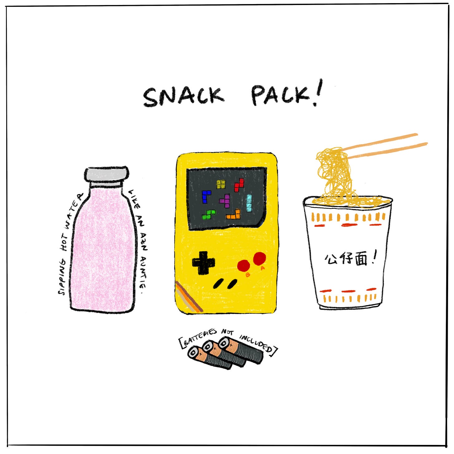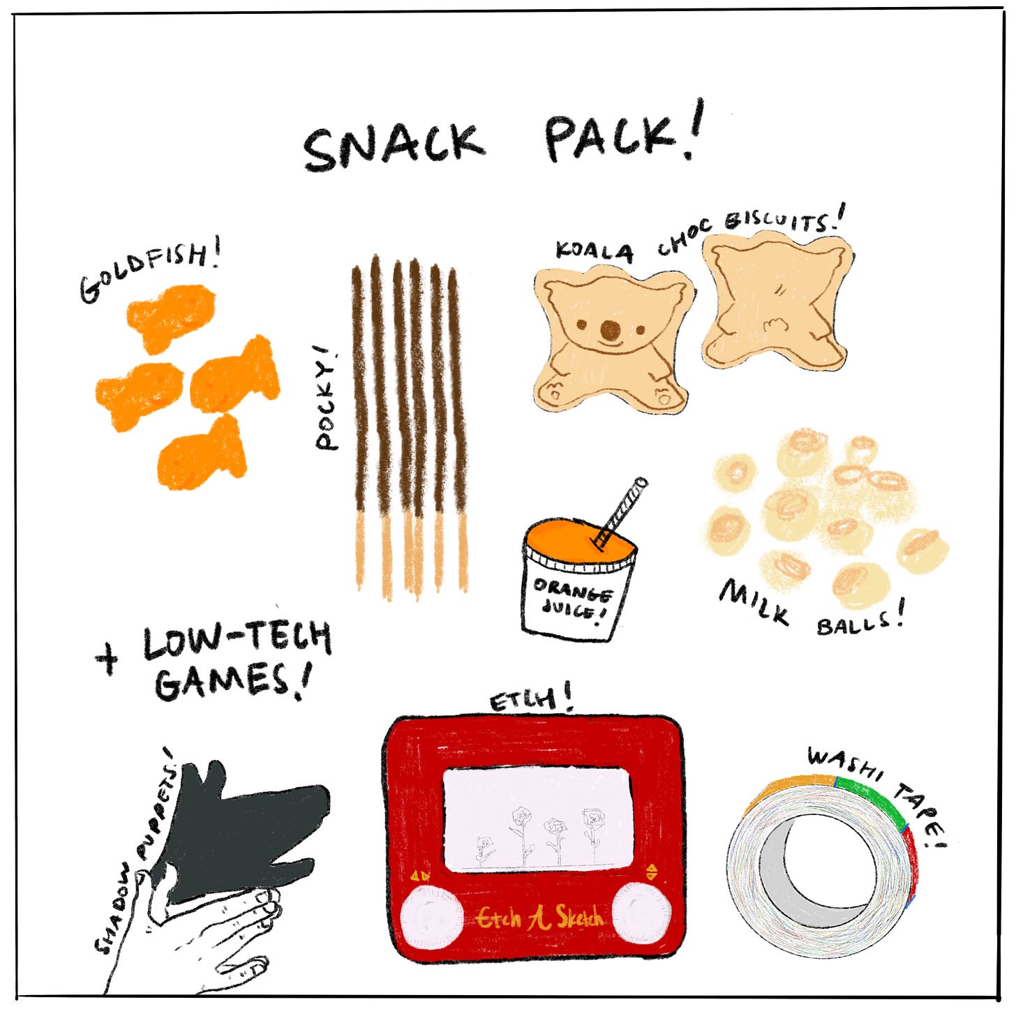 have you ever flown 18.5 consecutive hours roundtrip with a toddler who’s been given a screen time allowance of two bluey episodes? me too. i present to you: The Snack Pack.