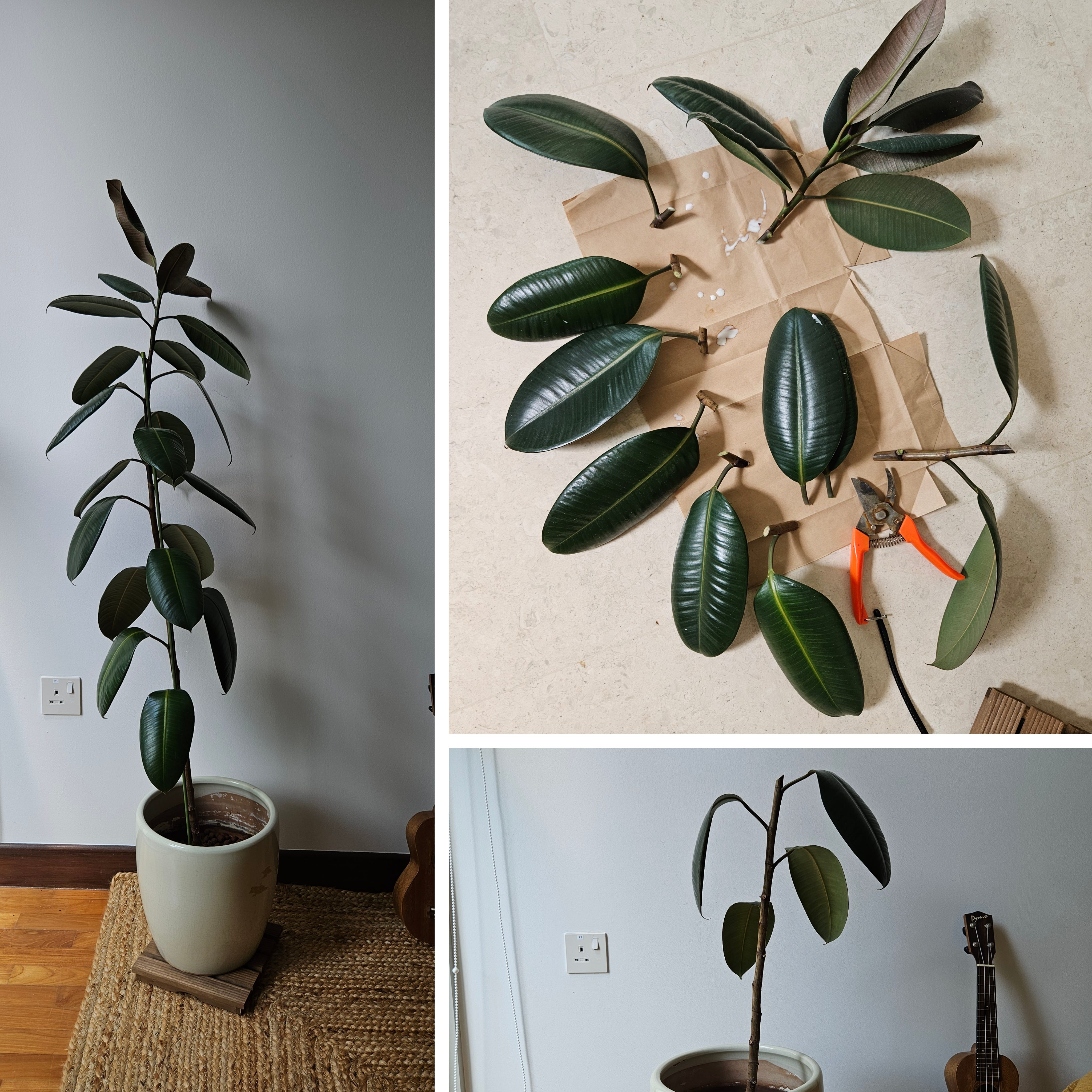 The main thing I did last week besides cough my lungs out was stare for hours at my plants, contemplating the most strategic way to decapitate them. I promise this is necessary for their health. I just cannot promise it will work. First up is Ficus Elastica who I bought as a sapling in 2019 for $10. It may potentially become nine new trees! Or fewer. Or none. A risk I’m willing to take for the chance of new life. Let’s watch and wait.